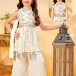 Elegant kids’ sharara set featuring a sleeveless embroidered peplum top, flowy sharara pants, and a matching dupatta. Perfect for festive occasions and celebrations.