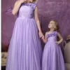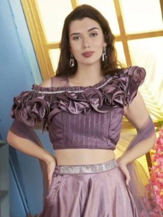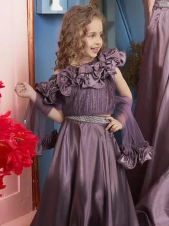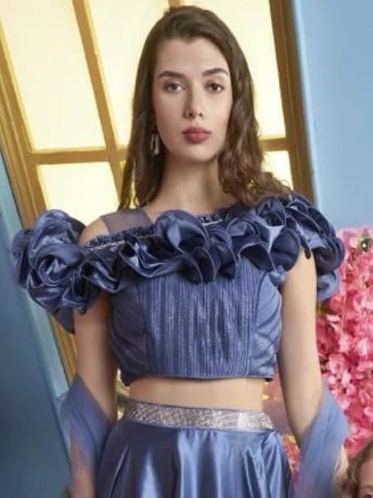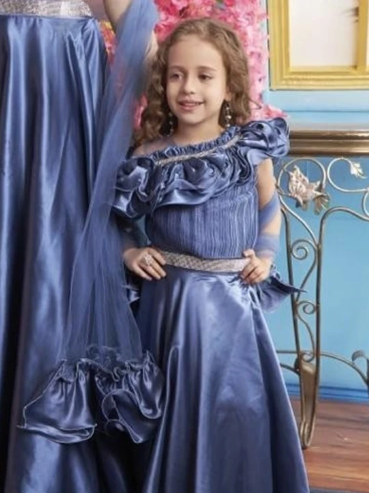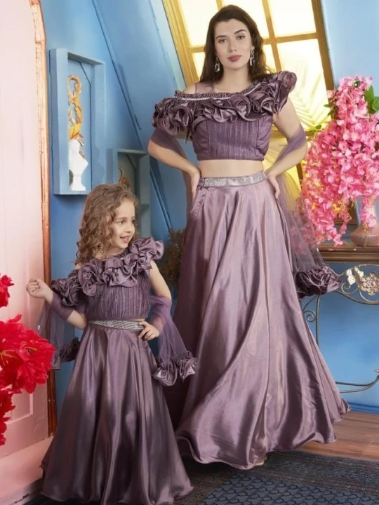 Step into elegance with this mesmerizing royal blue mother-daughter matching outfit. Designed with a modern touch, this two-piece ensemble features a ruffled off-shoulder crop top with intricate pleats, paired with a flowy A-line satin skirt. The shimmering waist belt accentuates the silhouette, adding a glamorous touch. With delicate net sleeves and ruffle detailing, this outfit is perfect for making unforgettable memories at weddings, festive celebrations, or formal gatherings.