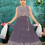 Elegant festive children’s outfit featuring a beautifully embroidered sleeveless jacket and a flared skirt with shimmering floral details. Crafted from premium fabric in rich purple with silver embroidery, it offers comfort and a regal look. Paired with a delicate white dupatta, it blends tradition with modern charm for special occasions.