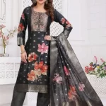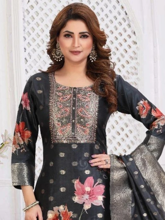 This Floral Print Straight Suit combines traditional charm with a modern touch. The silk-blend fabric ensures a rich look, while the delicate embroidery on the neckline adds elegance. Featuring an exquisite floral print with gold accents, this outfit is designed for a regal appeal.