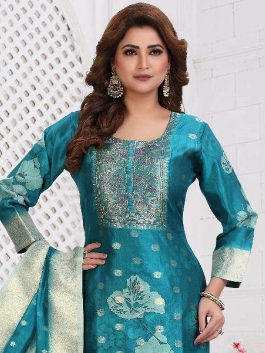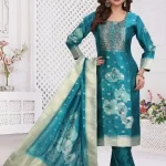 Add a regal touch to your wardrobe with this beautifully designed green salwar kameez set. Made from luxurious fabric, this outfit features intricate embroidery with floral patterns, exuding elegance and charm. The golden zari work on the neckline and hem enhances its opulent appeal.