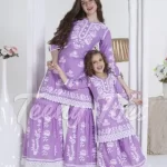 Celebrate tradition with style in this beautifully crafted Mother-Daughter matching outfit set. Made from soft, breathable fabric, this vibrant pink sharara suit features intricate white floral embroidery that exudes elegance and grace.
