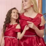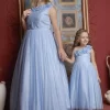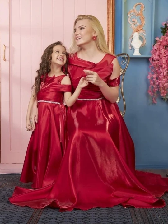 Celebrate love and togetherness with this stunning Mother-Daughter Matching Gown Set, designed to make you and your little princess shine on any special occasion. Crafted from premium satin fabric, these gowns feature a cold-shoulder design with elegant draping, adding a modern touch to the timeless silhouette. The fitted bodice is accentuated with a delicate silver belt, enhancing the waistline for a flattering look.