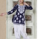 The Midnight Blossom Kurti Set is a graceful and timeless ethnic outfit perfect for festive gatherings and casual elegance. Featuring a deep navy blue kurti adorned with detailed white floral embroidery, this piece is both sophisticated and eye-catching. It is paired with classic white pleated salwar pants, offering comfort and cultural charm in one go.