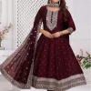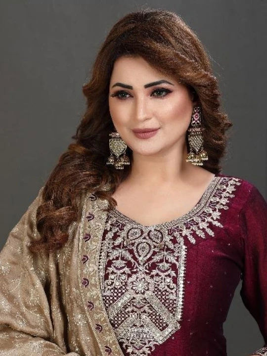 Step into sophistication with this Elegant Embroidered Suit, a perfect blend of traditional charm and modern grace. Designed with a beautifully embroidered Anarkali-style kurta, this outfit features intricate thread embroidery on the neckline, sleeves, and hem, creating a refined and regal look. The flowy silhouette adds a touch of grace, making it ideal for festive and formal gatherings.