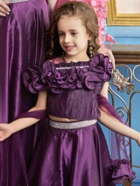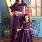 This stunning mother-daughter matching outfit is designed to add a royal touch to your special moments. The set features a gorgeous floor-length flared skirt paired with a beautifully textured off-shoulder blouse adorned with ruffled detailing. The shimmering silver belt accentuates the waistline, adding a refined touch to the ensemble. Made from premium satin fabric, this outfit ensures a luxurious feel and a graceful drape. The elegant sheer net sleeves enhance the charm, making it an ideal choice for special occasions such as weddings, parties, family photoshoots, and festive celebrations