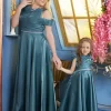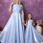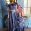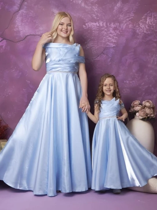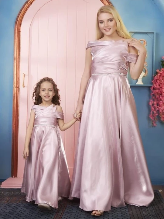 Make every moment special with this stunning mother-daughter matching gown set. Designed in a luxurious satin fabric, this gown set features an off-shoulder wrap-style bodice, adding a touch of elegance and sophistication. The flowy A-line skirt enhances the royal look, ensuring both comfort and grace. Whether it’s a wedding, formal event, or a special occasion, this dress set is the perfect choice for a stylish and coordinated appearance.