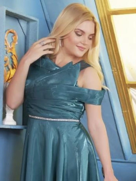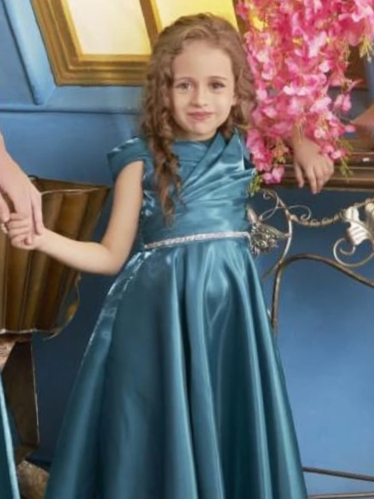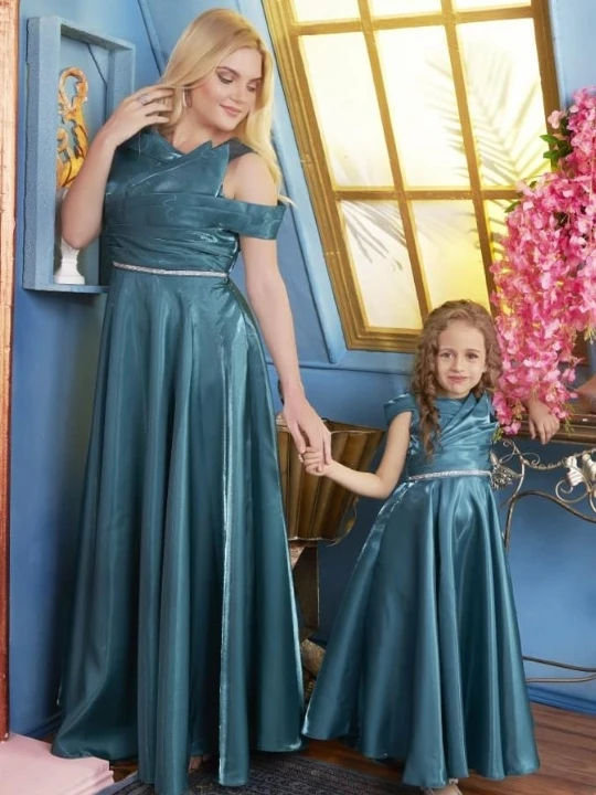 Make a stylish statement with this stunning teal mother-daughter matching gown set. Crafted from premium satin fabric with a lustrous sheen, this gown set features a beautifully designed bodice with an off-shoulder wrap detail for mothers and a sophisticated cap-sleeve design for daughters. The fitted waistline is accentuated with a delicate embellishment, adding a touch of elegance. The flared A-line skirt gracefully flows, making this the perfect outfit for evening events, weddings, and special celebrations.