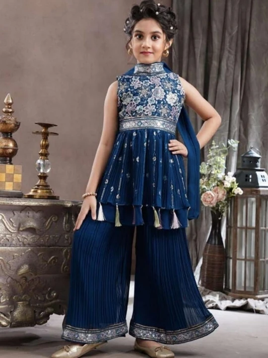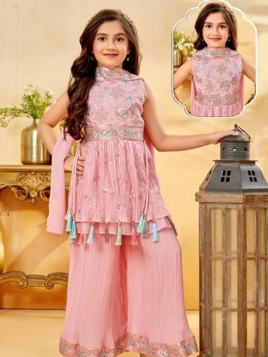 This stylish and elegant sharara suit is designed for girls who love to shine at special occasions. Featuring a sleeveless peplum-style top with intricate floral embroidery and mirror work, it adds a touch of sophistication. The layered tassel detailing enhances the charm of the outfit. Paired with a flared sharara pant, this ensemble is perfect for festive occasions, weddings, and parties. The lightweight fabric ensures comfort, while the matching dupatta completes the ethnic look.